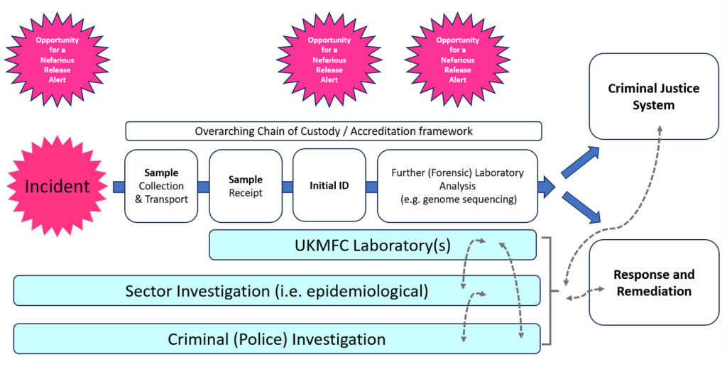El Consorcio UKMFC representa un nuevo estrato del sistema de alerta biológica del Reino Unido (es decir, un concepto de «detección-atribución»). Su proceso de investigación, las posibles etapas de alerta por liberación ilícita y la identidad de otros organismos de investigación posibles se resumen en la Figura 1.
